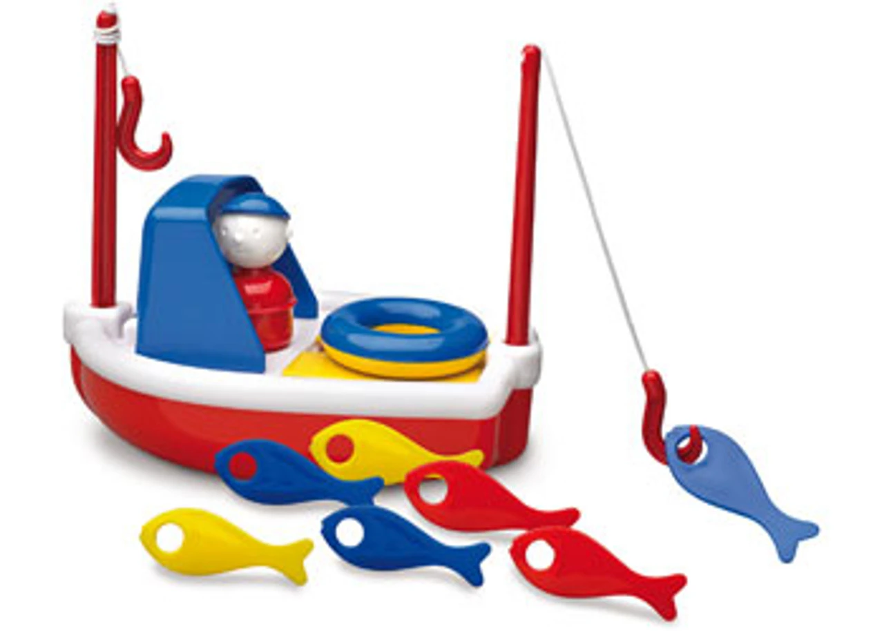 A special fishing boat for non-stop bath time fun. The steering wheel doubles up as a life ring in case the captain falls overboard, the masts become a fishing game for two and all the little fishes can be stored underboard in a secret hatch.