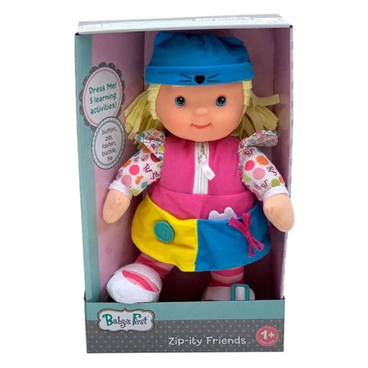 Zippity familiarizes children with skill requited to dress themselves – Includes a Zipper, a Button, String for tying, a Buckle and Velcro