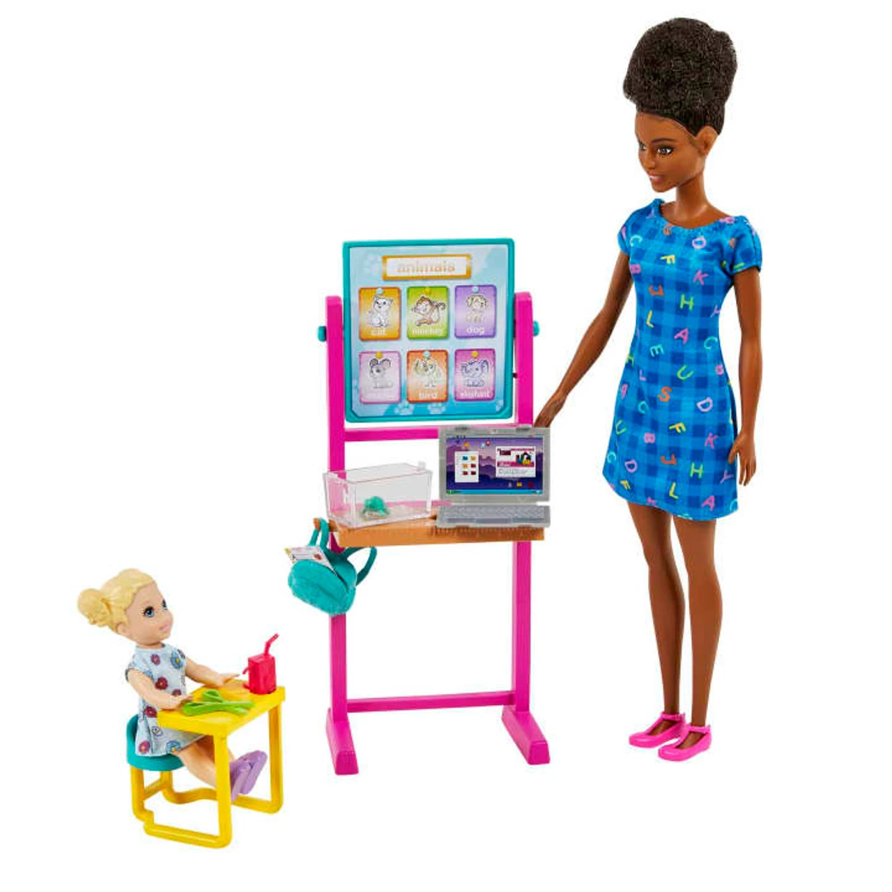 - Barbie® teacher doll has a laptop so she can help her students learn virtually, too! There’s even a classroom pet turtle who comes in a clear, open container.