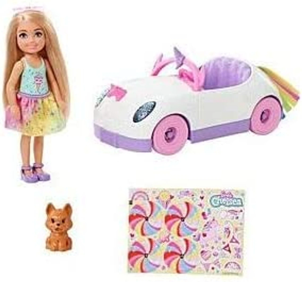 - Hit the road and discover storytelling adventures with a 6-inch Chelsea doll, her pet puppy and their adorable, unicorn-inspired car