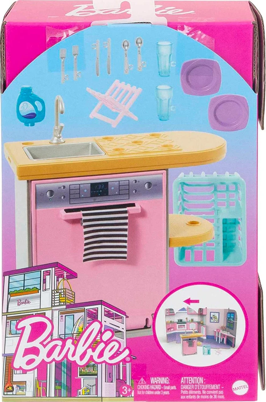 - ​Kids can get their imaginations rolling with some kitchen cleaning! This Barbie accessory pack includes a piece of furniture and assorted décor items.