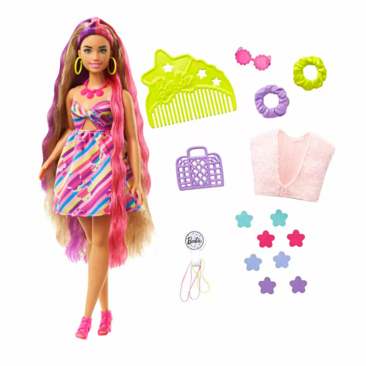 Inspired by the best-selling Barbie® doll that first made waves 30 years ago, the Barbie® Totally Hair™ flower-themed doll rocks her own hairstyle, hair texture and fashion look! The doll has 8.5 inches of extra-long playable hair and comes with 15+ additional pieces including 8 color change hair clips, styling accessories and an extra fashion. Barbie® doll has a curvy body shape and comes with bright pink and purple color block streaks in her wavy hair that also has a ponytail on top. She wears a vibrant daisy printed dress with a cut-out detail. Kids will love creating different hairstyles and the endless styling possibilities! Doll cannot stand alone. Colors and decorations may vary. For kids 3 years old and up.