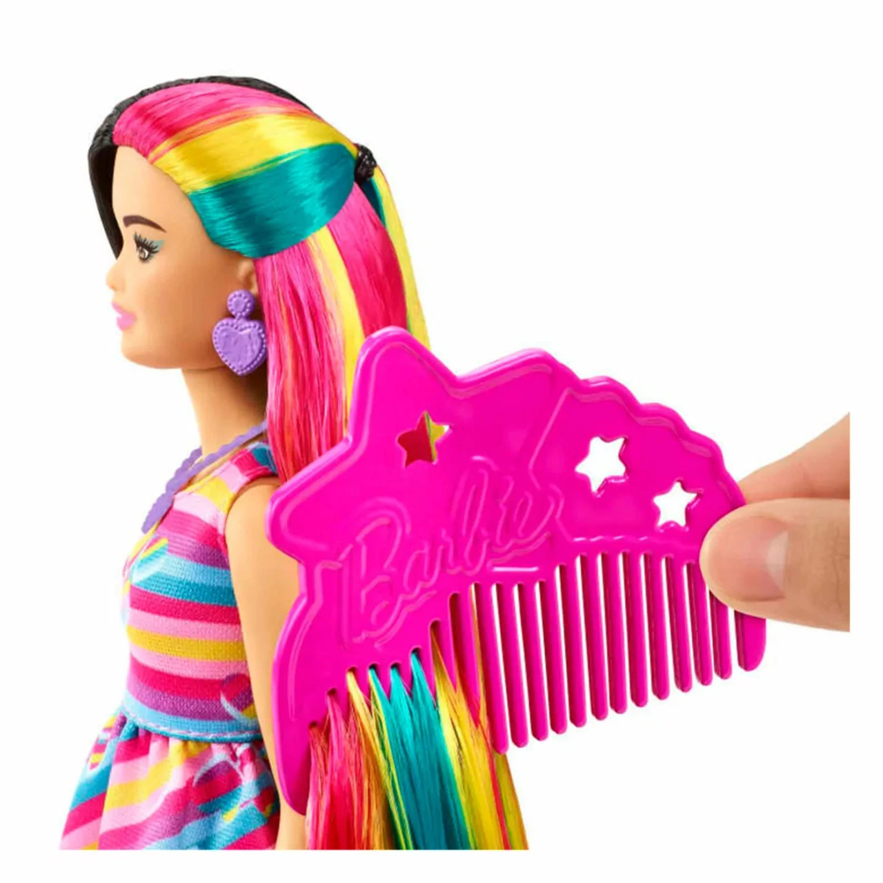 - Barbie® doll has 8.5 inches of extra-long playable hair and comes with 15+ additional pieces: 8 are color change hair clips, a comb, 1 set of hair ties, 2 scrunchies, metallic blouse fashion, purse, sunglasses and a necklace.