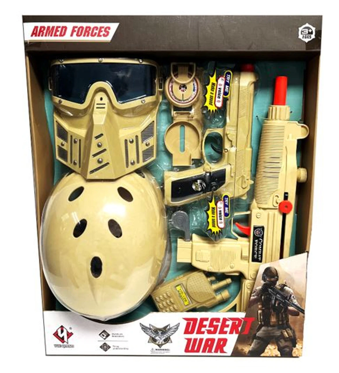 Set contains face mask/goggles, folding compass, pistol, machine gun, whistle, radio and helmet