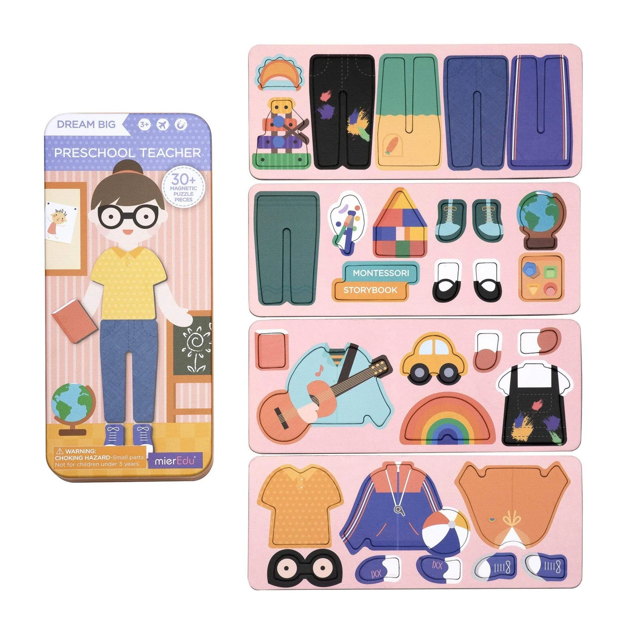 The Teacher set includes two scenes and more than 30 magnetic puzzle pieces, where they can dress up their character and invent their own stories. Using touch and feel, kids can play with both hands to stimulate their left and right brain development.