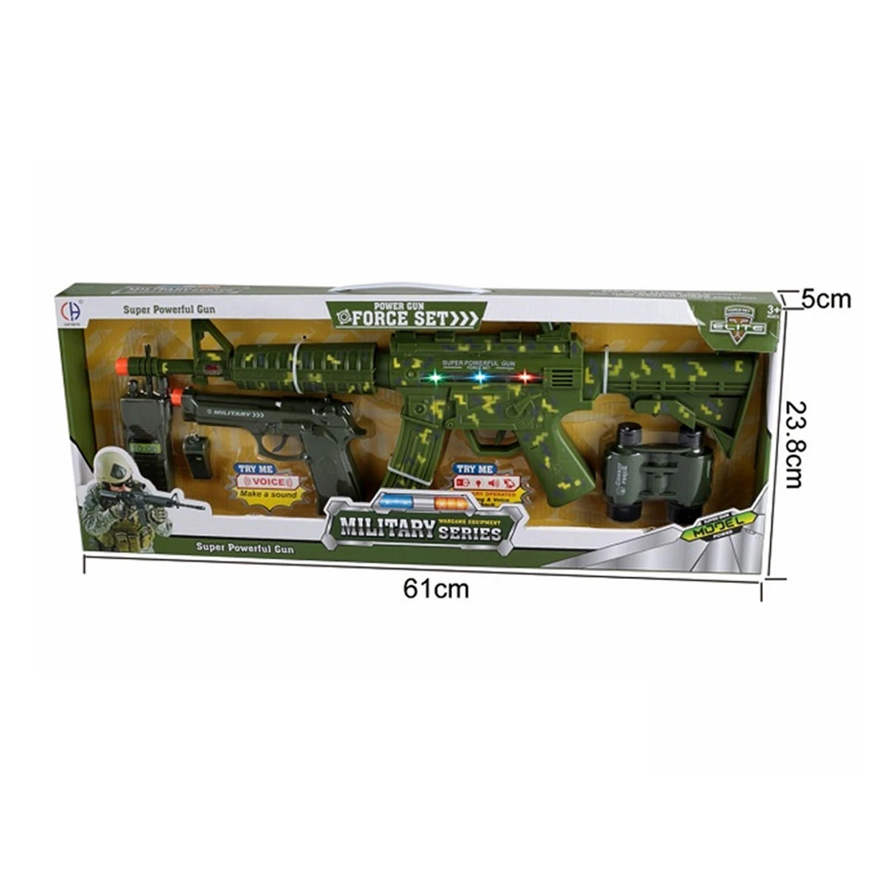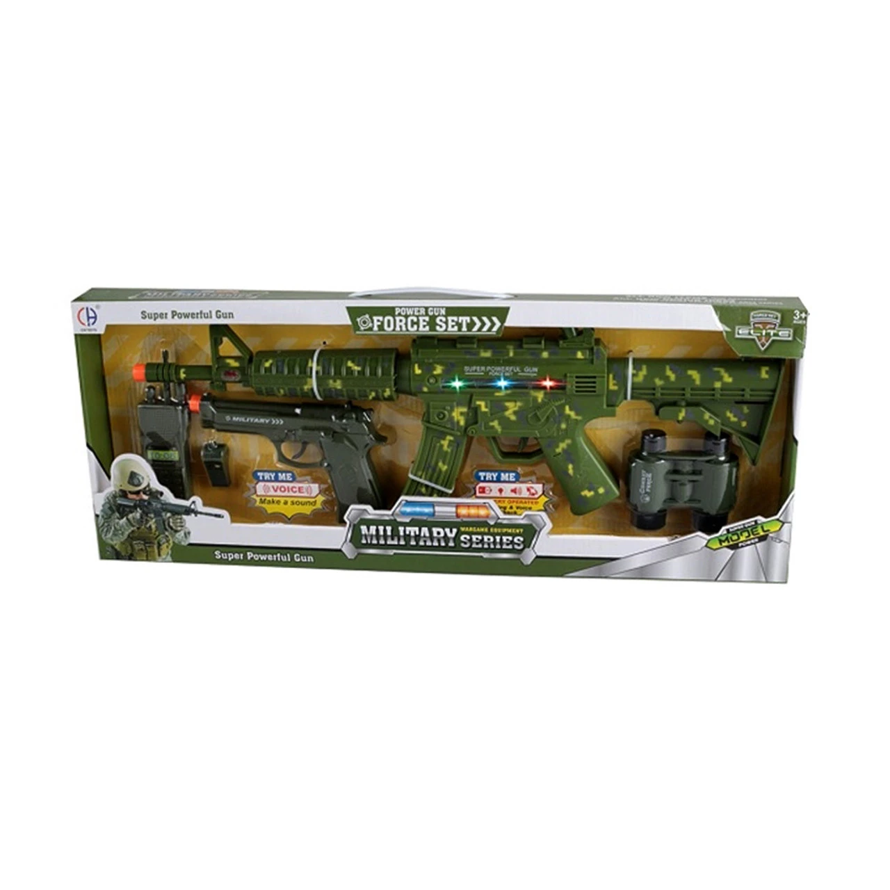 Includes: M4 assault rifle, baretta hand gun, whistle, walkie talkie and binoculars