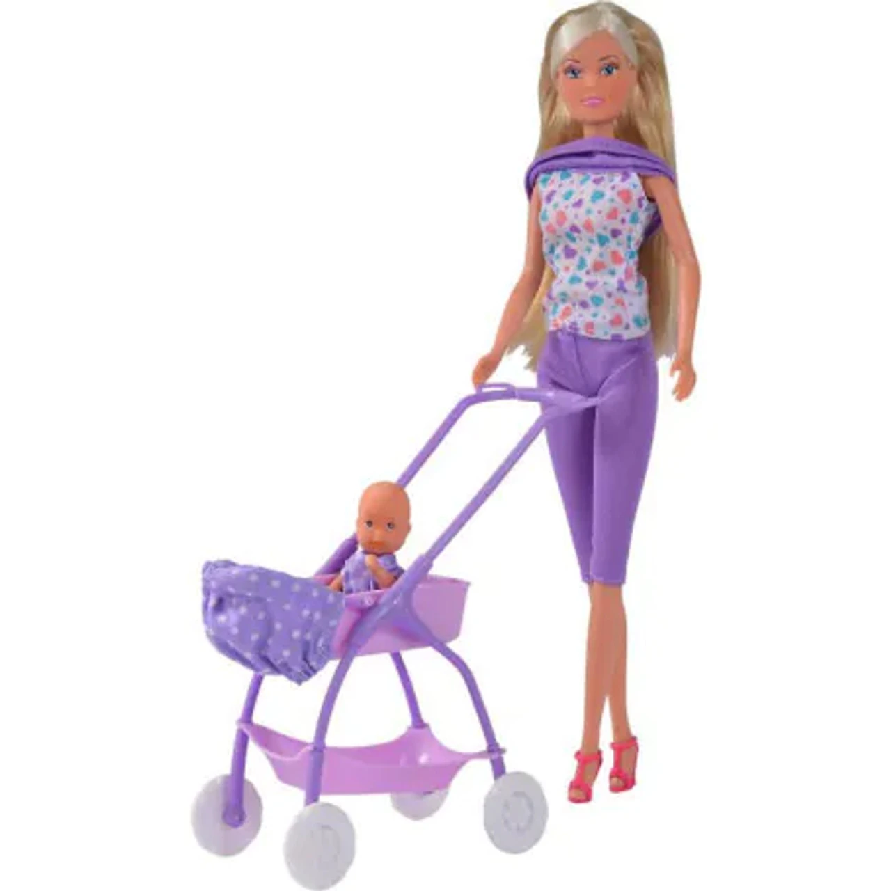 Put Steffi’s little one in the baby buggy then push her along with your 29cm Steffi doll.